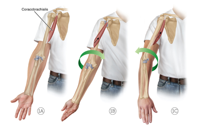 If, instead, the humerus is first medially rotated relative to anatomic position, then the coracobrachialis has to wrap around the shaft of the humerus in the opposite direction, and its humeral attachment ends up being located more posterolaterally relative to the trunk. If the coracobrachialis contracts and shortens from this position, it will pull on the humerus, again rotating it back to anatomic position. But this motion is lateral rotation of the humerus at the GH joint (Image 1C). So, the coracobrachialis can also be a lateral rotator of the arm at the GH joint, but only if the arm is first in a position of medial rotation.