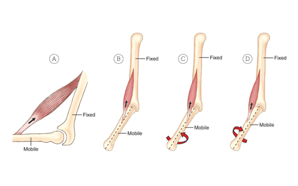 But in Image C, the muscle is instead shown attaching "off-axis," to one side. Now, the muscle would pull the mobile bone toward the fixed bone but would also rotate the mobile bone, as represented by the arrow seen in the figure. And in Image D, the muscle is now seen attaching "off-axis" on the other side, and the arrow in the figure shows that the muscle now has the opposite rotation motion. The ability to create rotation, or any motion for that matter, is based on whether the muscle in question attaches over the axis of motion—in other words, on-axis—or whether the muscle attaches off-axis.